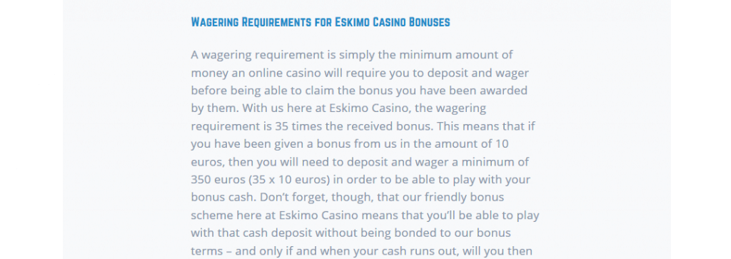 De inzetvereisten is simpelweg het minimale bedrag dat een online casino van je vereist om in te zetten voordat het mogelijk is om de bonus uit te laten betalen. Bij Eskimo Casino zijn deze inzetvereisten 35x de ontvangen bonus. Dat betekent dat als je een bonus van 10 euro hebt ontvangen, je minimaal 350 euro moet hebben ingezet voordat je bonusgeld kunt uitbetalen. Vergeet niet, dat het vriendelijke bonussysteem ervoor kan zorgen dat je met geld kunt spelen dat niet gevonden is aan de bonusvoorwaarden, en pas als je zonder geld komt te zitten dan speel je verder met de ontvangen casino bonus.
